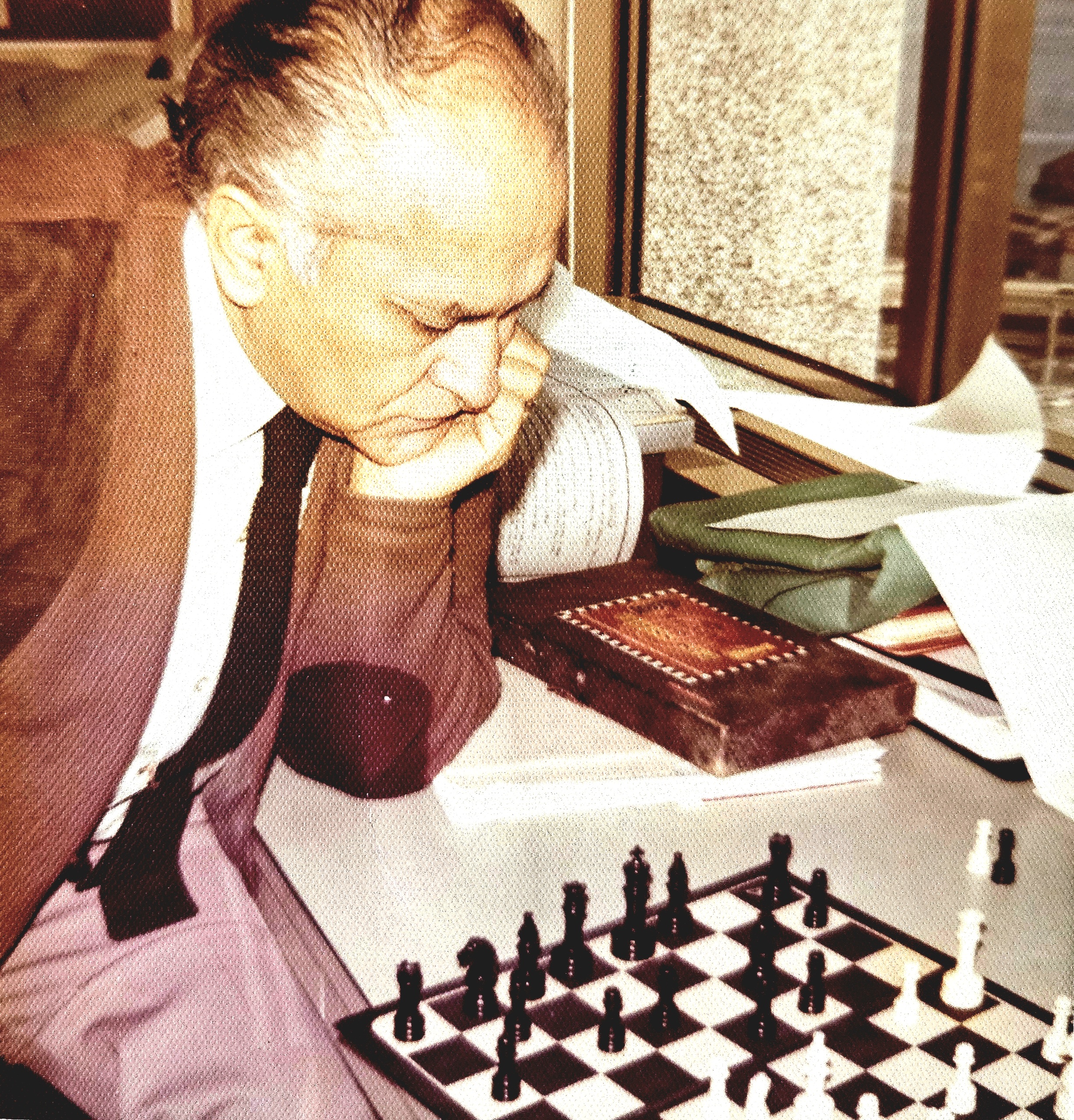 Picture above, my dad playing chess during work hours as an architect for Pacific Gas and Electricity (PG&E), in San Francisco, California. French Defense opening is in development. His opponent’s queen threatens a queen exchange with king’s side, black knight, caught in a pinned position. No worries. Chess is a very thoughtful game, sometimes lasting days. Time clock, usually in place by the side of the board, is absent. Most likely, this particular game was played during break or lunch.
